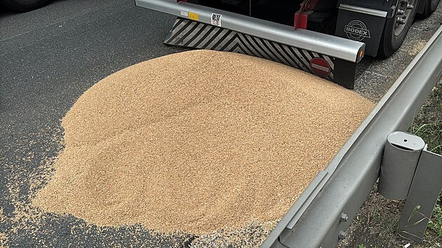 Vysypané obilí z kamionu blokuje jeden odbočovací pruh na Pražském okruhu. (2. června 2025)