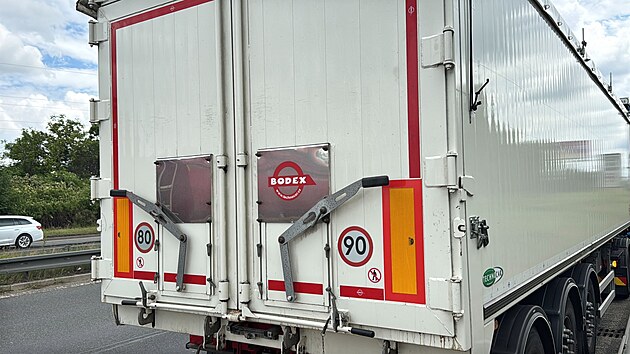 Vysypané obilí z kamionu blokuje jeden odbočovací pruh na Pražském okruhu. (2. června 2025)