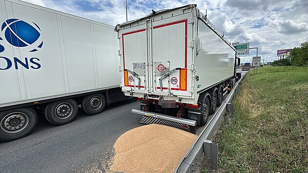 Vysypané obilí z kamionu blokuje jeden odbočovací pruh na Pražském okruhu. (2. června 2025)