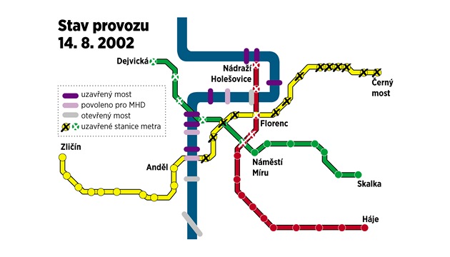 Plánek stavu provozu pražského metra k 14. srpnu 2002
