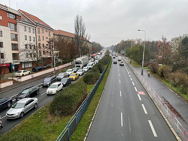 Kolony na Patočkově ulici v ranní špičce (22. listopadu 2022)