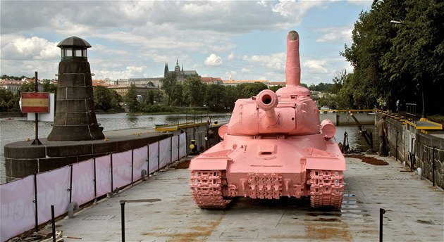 Převoz růžového tanku na plovacím pontonu. (20. června 2011)