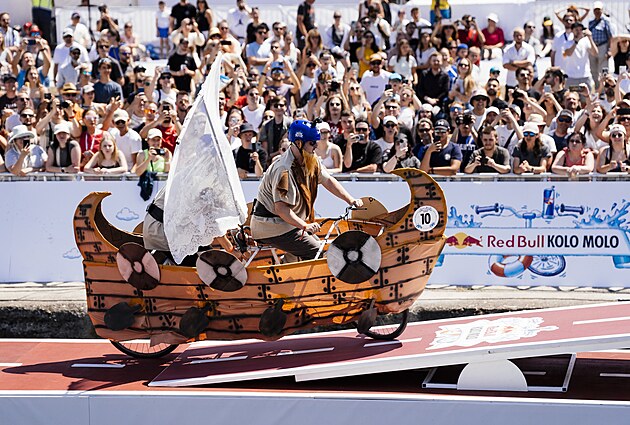 Red Bull Kolo Molo je bláznivá cyklistická výzva. Týmy na dvojkolech v maskách se pokoušely překonat stometrovou lávku s nástrahami. (21. června 2025)