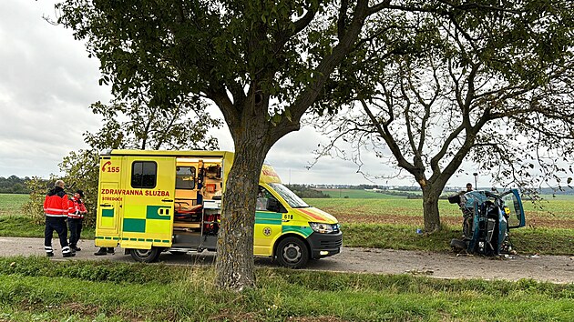 Nehoda auta u Říčan, řidič byl transportován vrtulníkem do Fakultní nemocnice Královské Vinohrady. (4. října 2024)