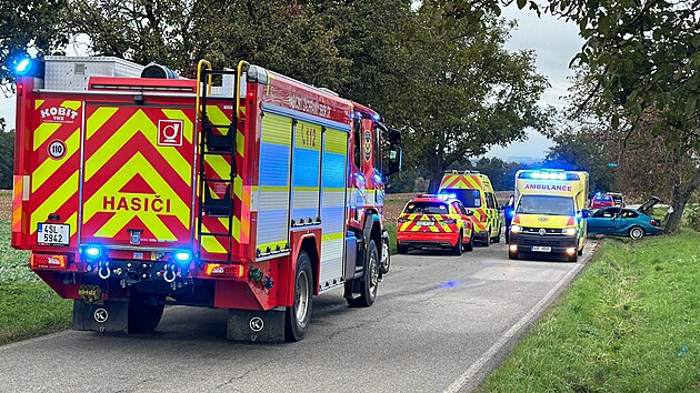 Nehoda auta u Říčan, řidič byl transportován vrtulníkem do Fakultní nemocnice Královské Vinohrady. (4. října 2024)