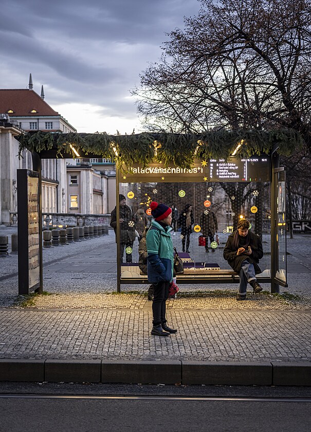 Zastávka Palackého náměstí ve směru na Karlovo náměstí se změnila na Vánoční. V nazdobeném přístřešku mohli zájemci napsat Ježíškovi, co by přáli sobě a městské hromadné dopravě v Praze. (18. prosince 2024)
