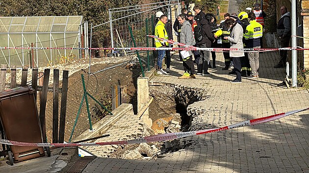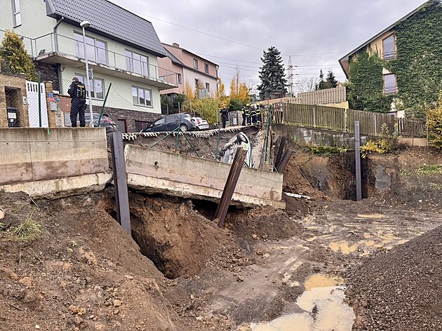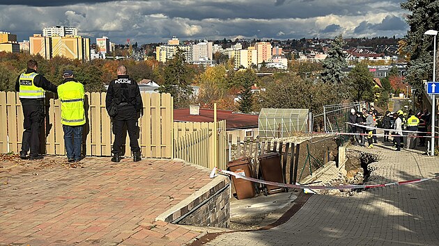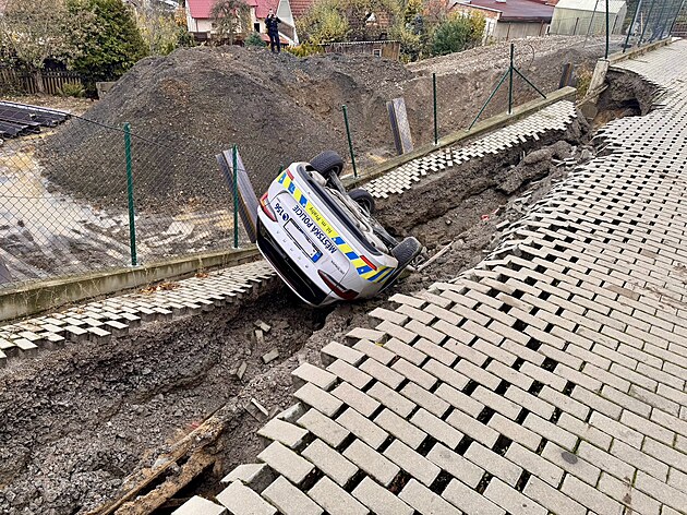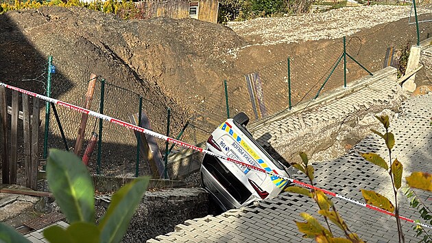 V Ostřicové ulici v pražských Stodůlkách došlo k sesuvu svahu a části vozovky. Při sesuvu spadlo služební vozidlo městské policie do vzniklé kaverny. (3. listopadu 2025)