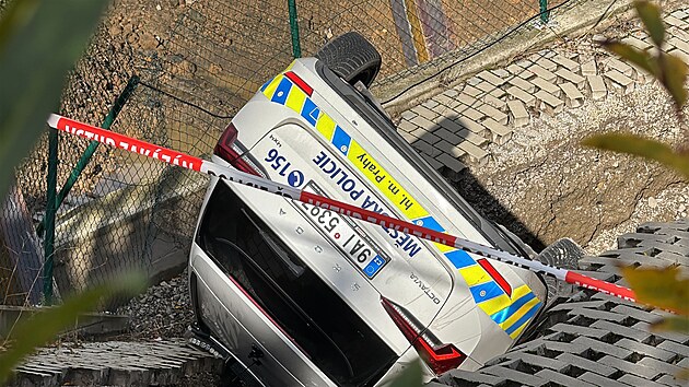 Sesuv půdy ve Stodůlkách strhl auto strážníků, převrátilo se na střechu. (3. listopadu 2025)