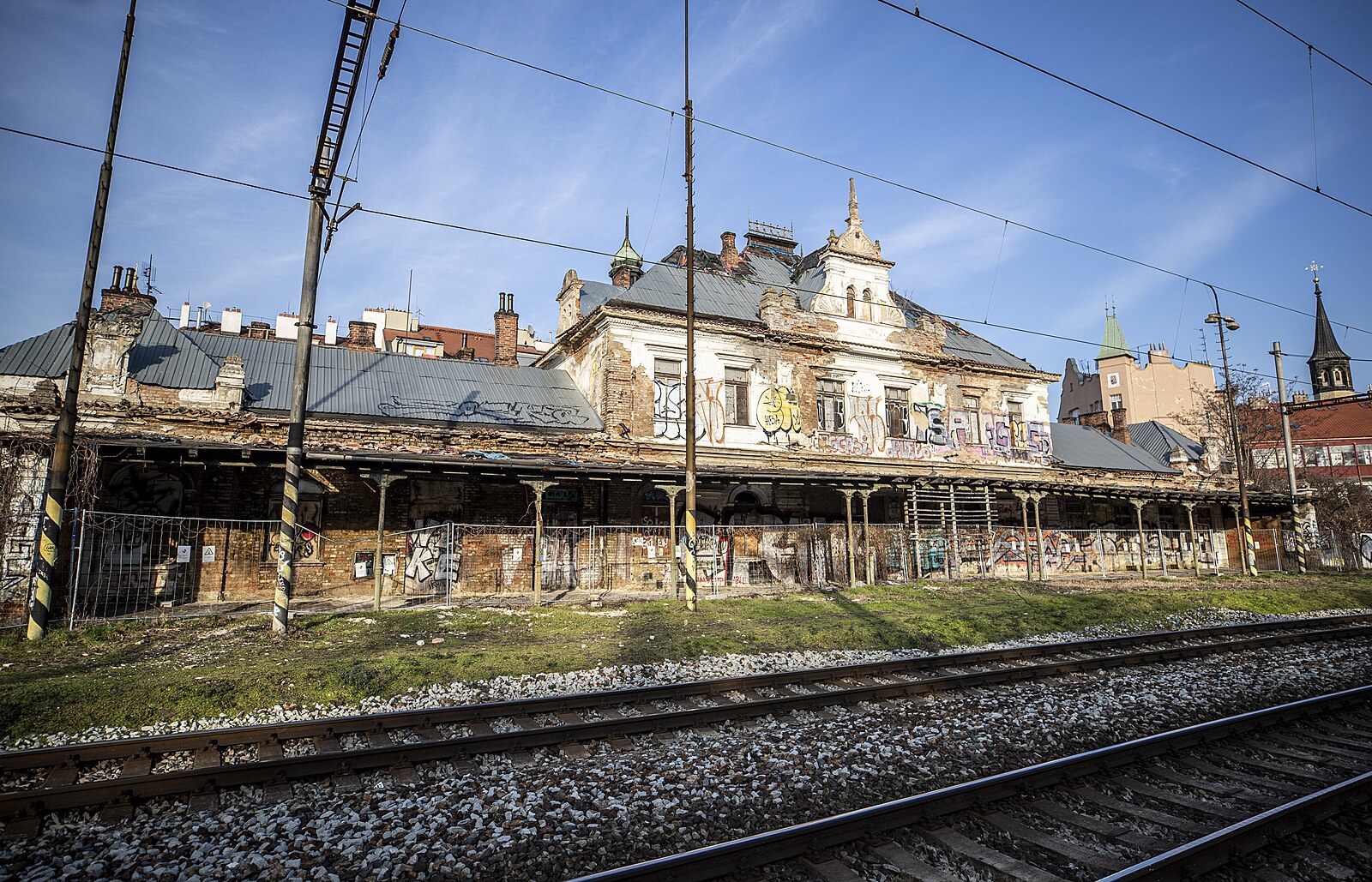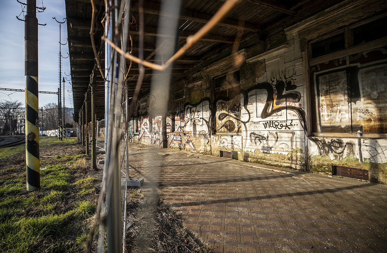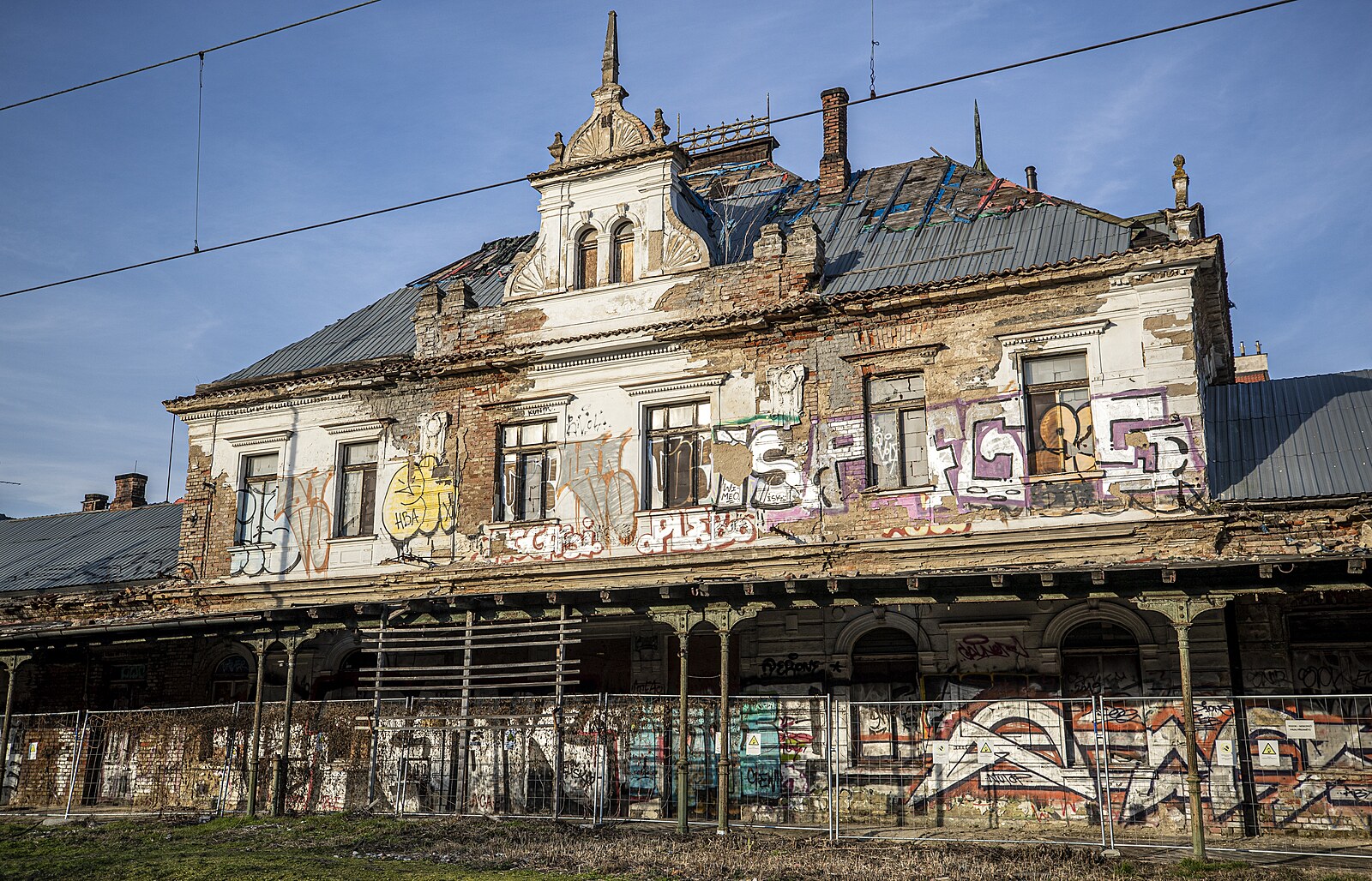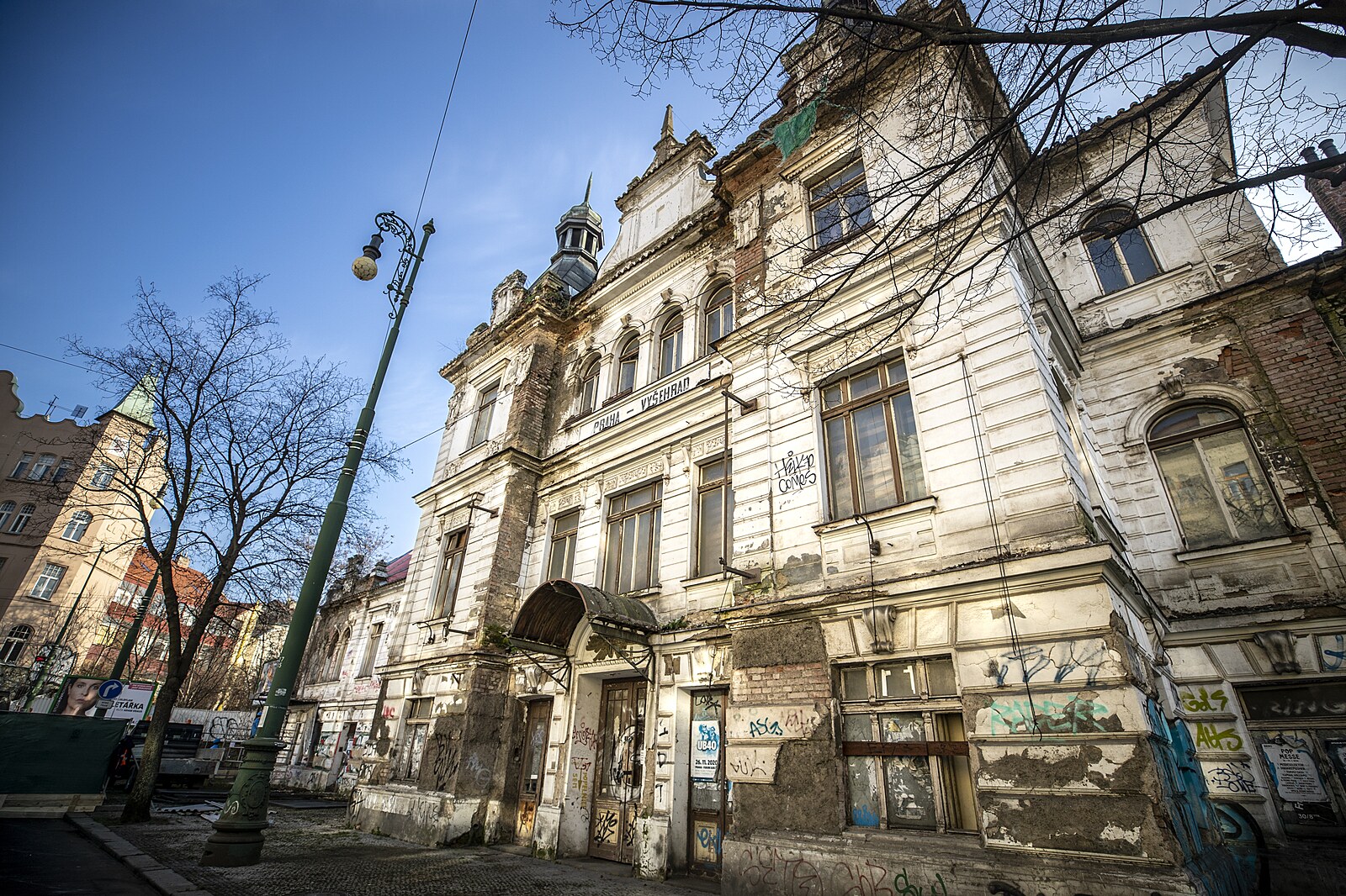 Rozpadající se nádraží Vyšehrad. Aktuálně je uzavřen chodník k sousední silnici kvůli padající omítce. (17. února 2023)