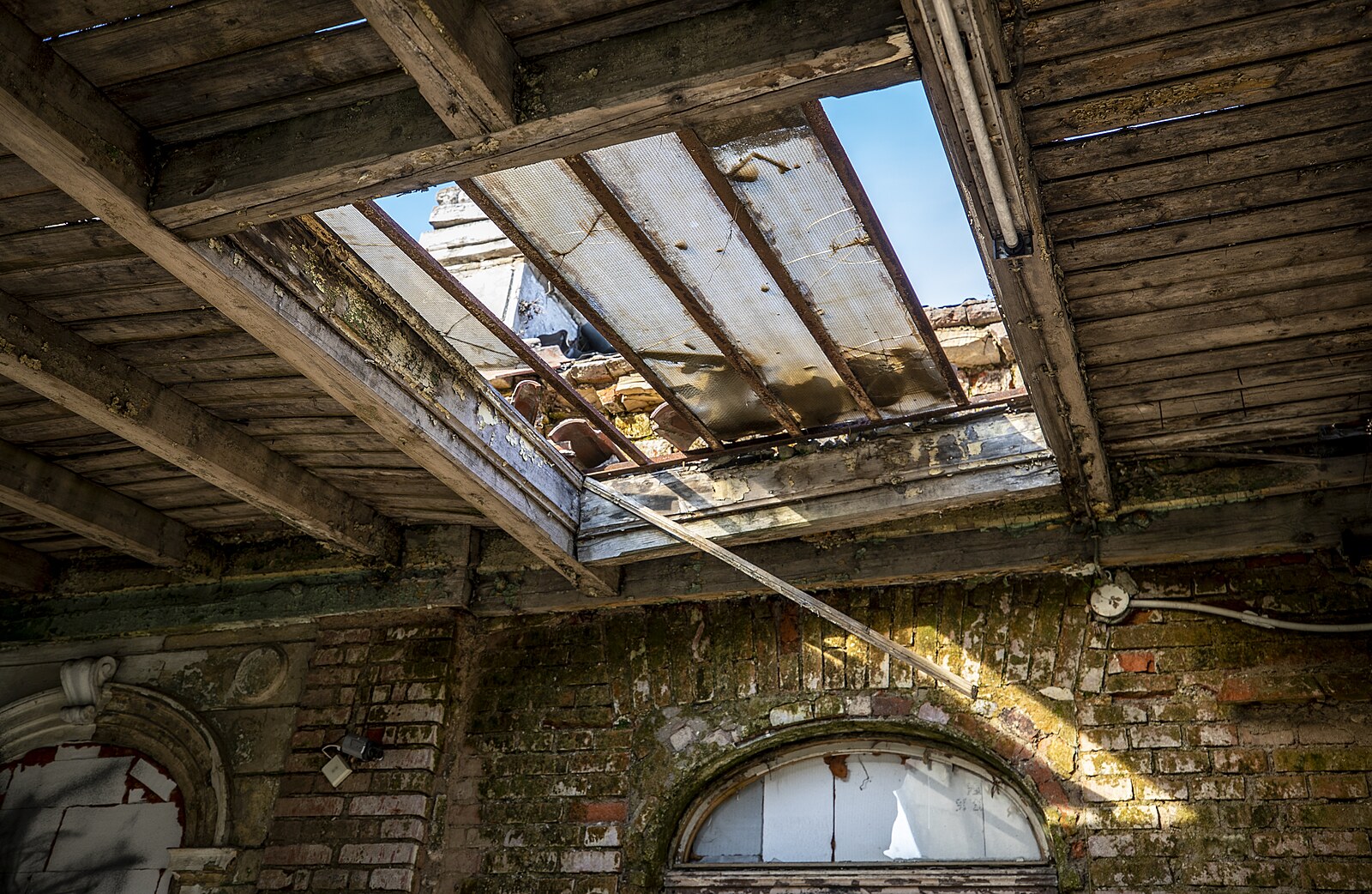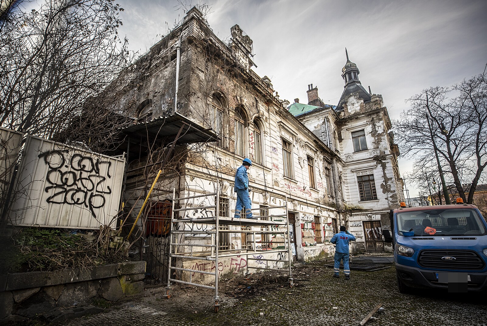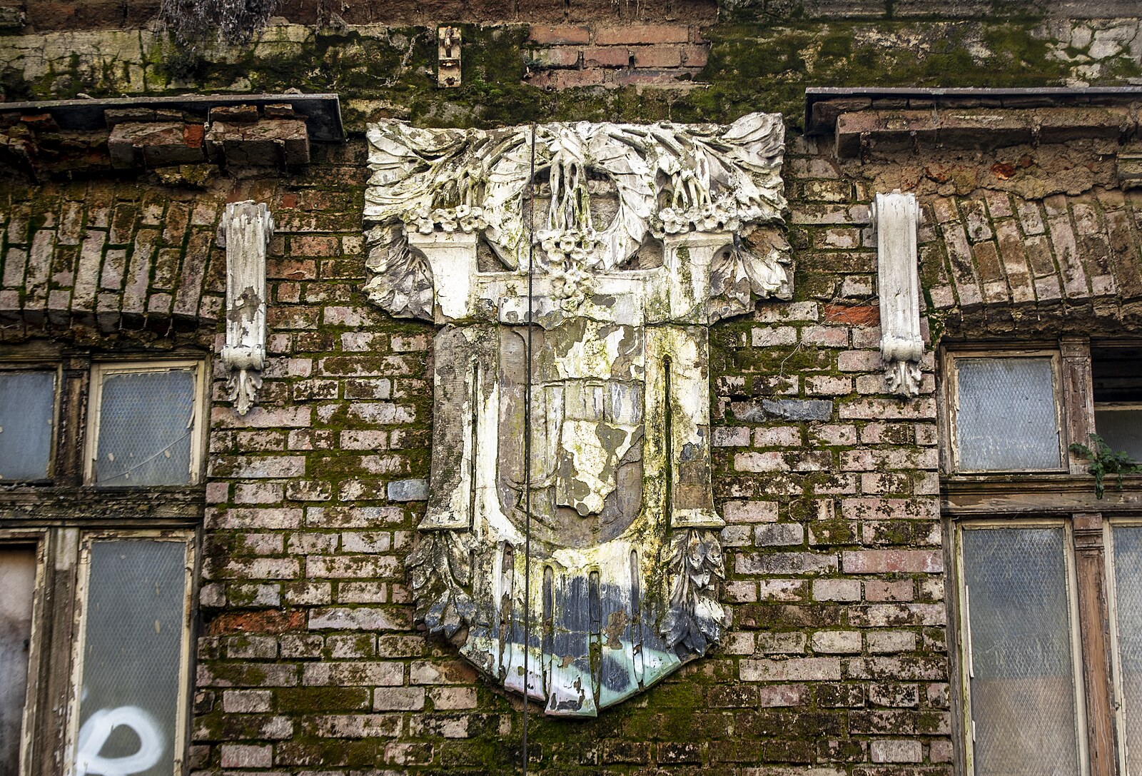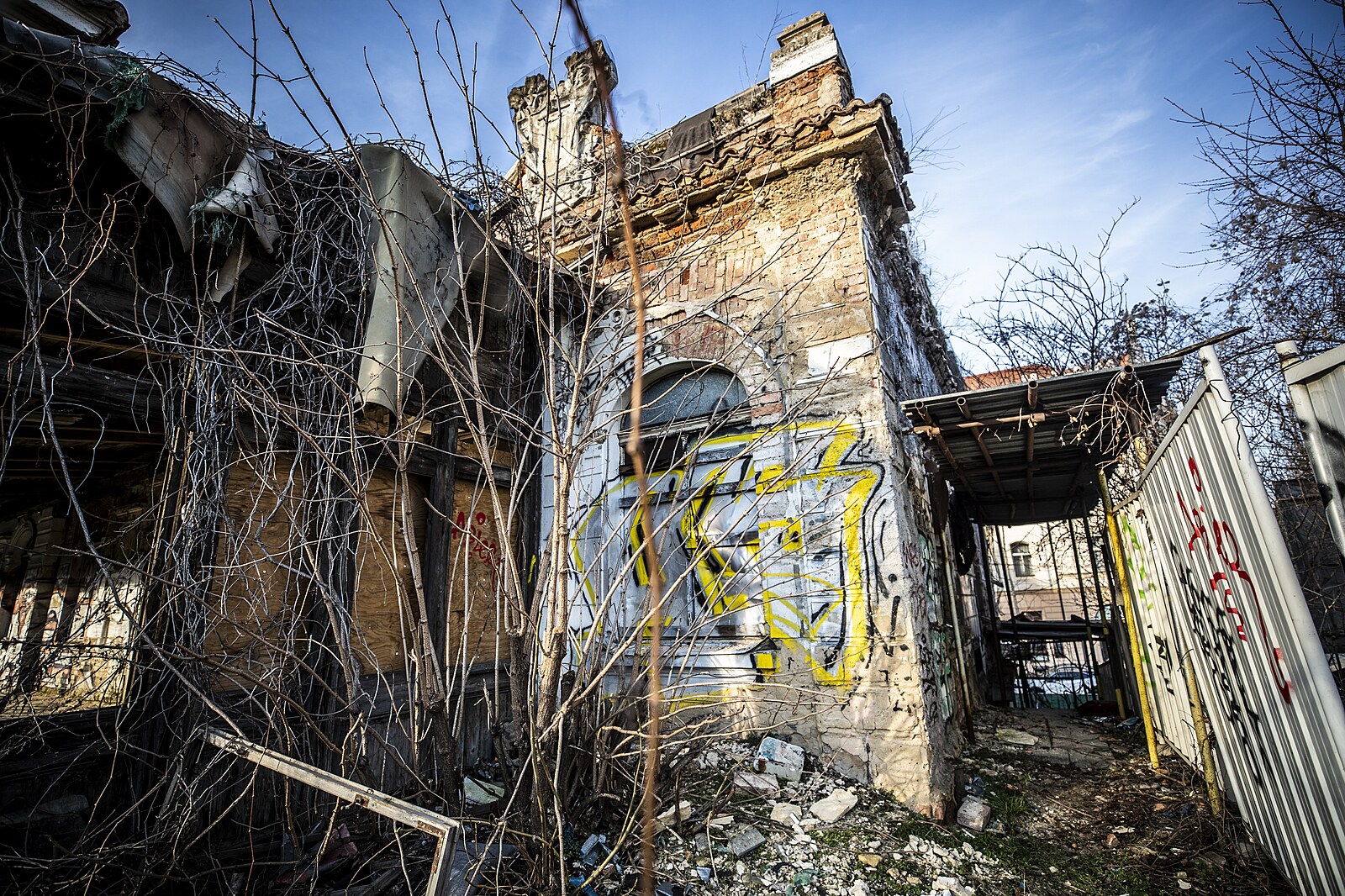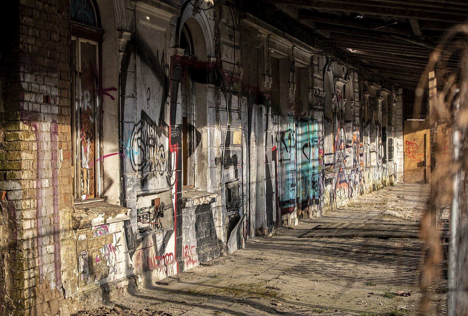 Rozpadající se nádraží Vyšehrad. Aktuálně je uzavřen chodník k sousední silnici kvůli padající omítce. (17. února 2023)