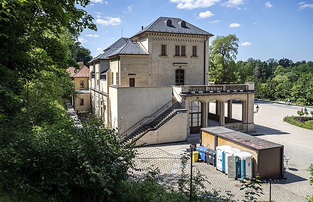 Chlouba Stromovky. Šlechtova restaurace je napůl opravená od roku 2021. Tehdy dělníci dokončili rekonstrukci kulturního sálu. Ve druhé fázi tam mají vzniknout například tři gastroprovozy. (13. dubna 2024)