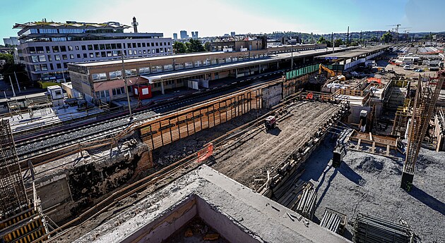 Rekonstrukce smíchovského nádraží je v plném proudu. Rok a půl po zahájení modernizace postoupila, buduje se podchod a nová lávka. (25. srpna 2025)