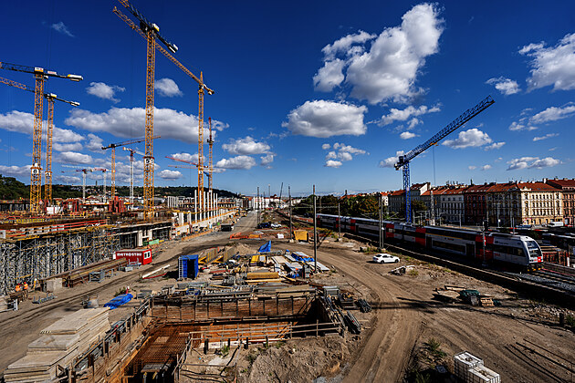 Rekonstrukce smíchovského nádraží je v plném proudu. Rok a půl po zahájení modernizace postoupila, buduje se podchod a nová lávka. (25. srpna 2025)