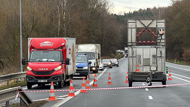 Uzavřená silnice I/3 po nehodě u Senohrab.
