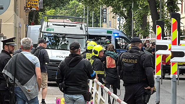 Zásahová jednotka za pomoci plošiny dostala dolů účastníky protestu. (30. května 2025)