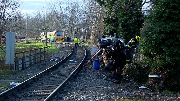 V pražské Liboci se srazil vlak s autem, hasiči vyprostili tři lidi