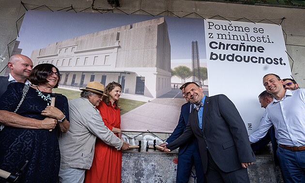 V pondělí se konalo slavnostní zahájení hlavní etapy revitalizace nádraží Praha-Bubny a jeho proměny na Centrum paměti a dialogu Bubny. Zleva architekt Jiří Krejčík, projektant Petr Kniha, izrealská velvyslankyně v ČR Anna Azariová, výtvarník Jaroslav Róna, ředitelka Centra paměti a dialogu Bubny Pavlína Šulcová, ministr dopravy Martin Kupka, ministr kultury Martin Baxa, generální ředitel Správy železnic Jiří Svoboda a předseda Federace židovských obcí Petr Papoušek. (14. července 2025)