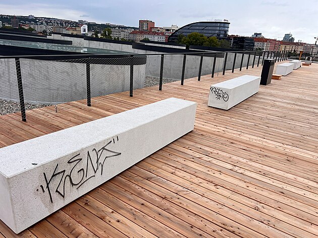 Lavičky na terase nové budovy Nádraží Bubny jsou jen několik dní po zprovoznění trati počmárané.