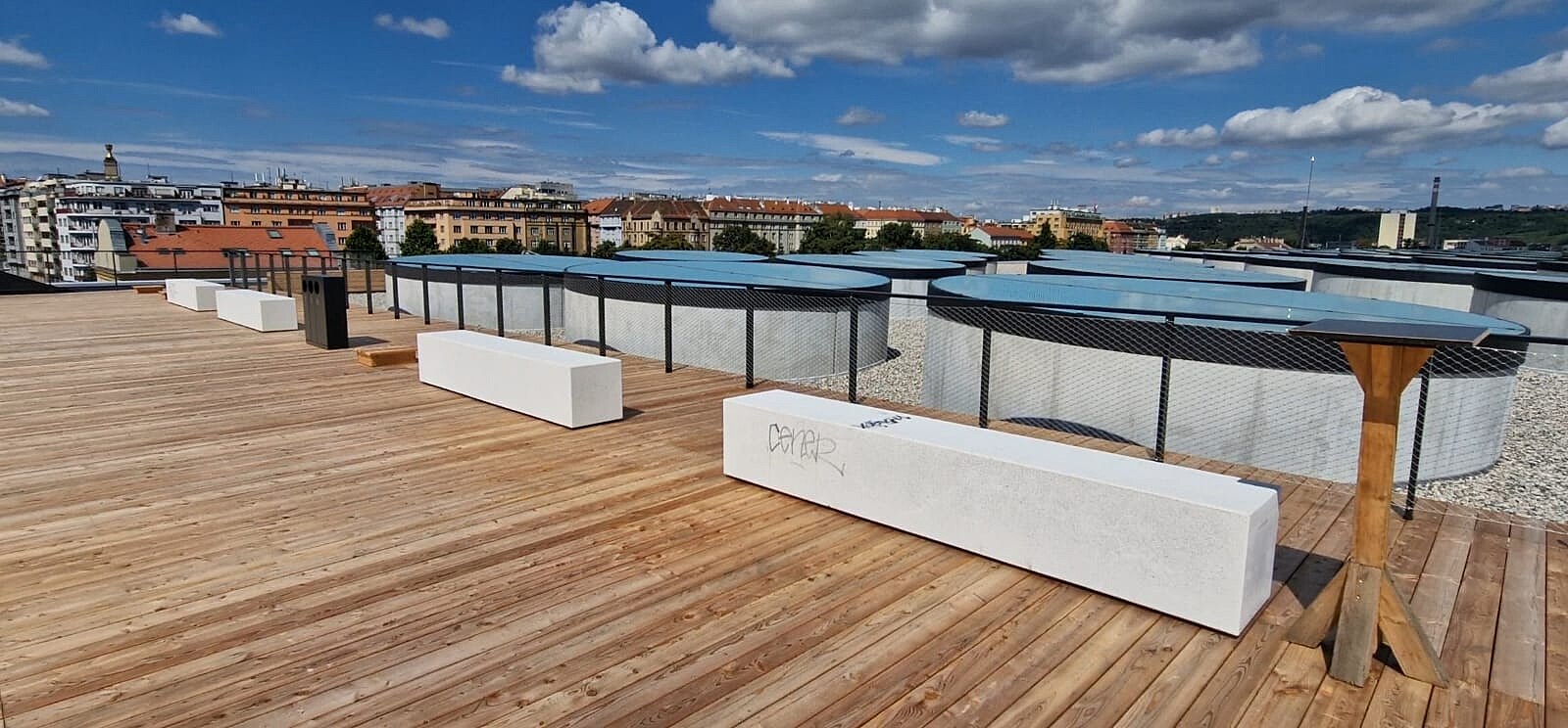 Rekonstrukce pražské železnice mezi Bubny a Výstavištěm je hotová pár dní, na nepřístupné terase na střeše bubenského nádraží jsou již pomalované lavičky. (5. srpna 2025)