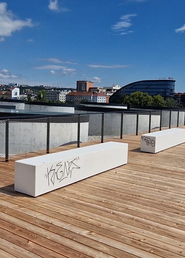 Rekonstrukce pražské železnice mezi Bubny a Výstavištěm je hotová pár dní, na nepřístupné terase na střeše bubenského nádraží jsou již počmárané lavičky. (5. srpna 2025)