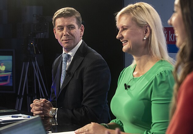 V pořadu Krajský DUEL Rozstřel za Středočeský kraj jsou hosty (zleva) Jan Skopeček za ODS a SPOLU (na snímku), Petra Pecková za STAN, Tomáš Helebrant za ANO (na snímku) a Magdaléna Davis za Zelení a SEN 21.