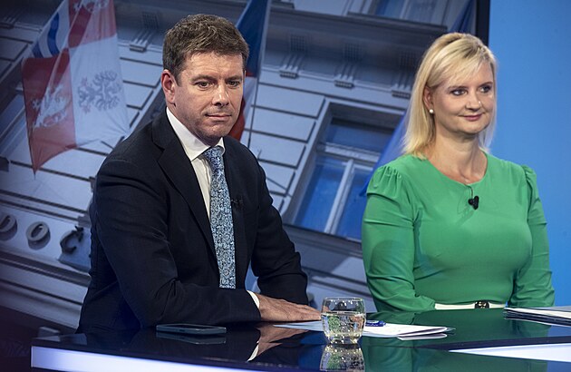 V pořadu Krajský DUEL Rozstřel za Středočeský kraj jsou hosty (zleva) Jan Skopeček za ODS a SPOLU, Petra Pecková za STAN, Tomáš Helebrant za ANO a Magdaléna Davis za Zelení a SEN 21.