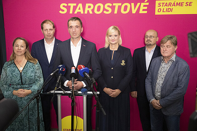Tisková konference hnutí STAN po volbách do Senátu. Na fotografii Ondřej Lochman, Lukáš Vlček a Petra Pecková (28. září 2024)
