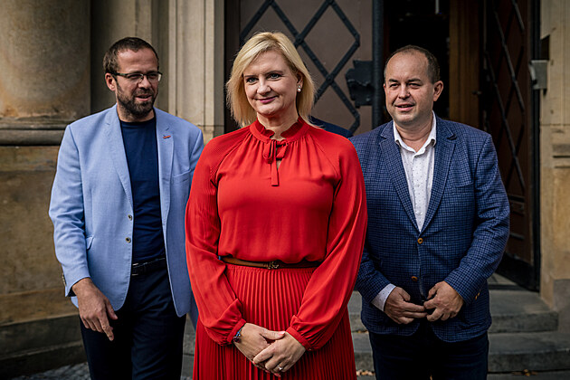 Povolební jednání zástupců STAN a SPOLU po krajských volbách ve středních Čechách. Na snímku uprostřed hejtmanka Středočeského kraje Petra Pecková. (30. září 2024)