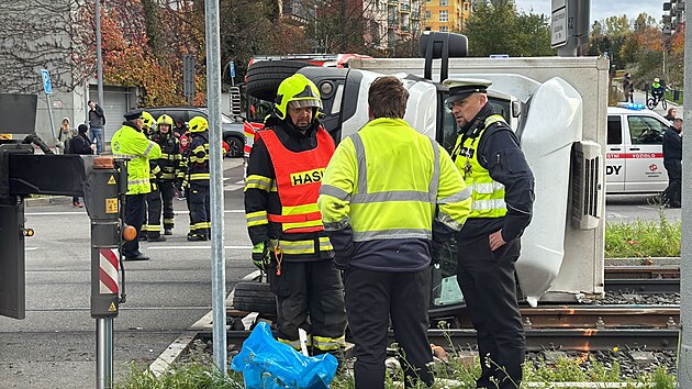 Dodávka po střetu s tramvají zůstala ležet na boku. (27. října 2025)