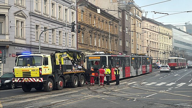 Na tramvajové zastávce Radlická odtahují vykolejenou tramvaj. (28. března 2025)