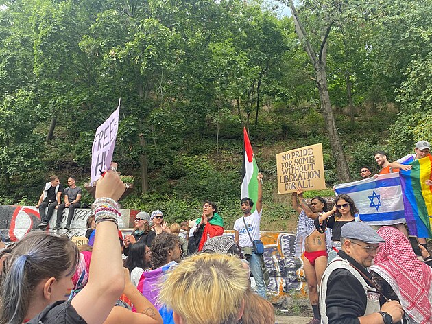 Na letenské pláni protestovalo několik propalestinských demonstrantů. „Prague Pride you can’t hide. You’re supporting genocide“ vyřvávali protestující. (2. srpna 2025)