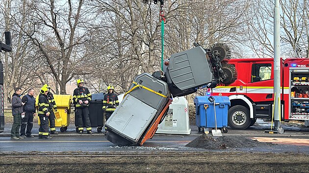 V Praze v ulici Bělohradská se převrátil vůz, který zametá chodníky. (24. února 2025)