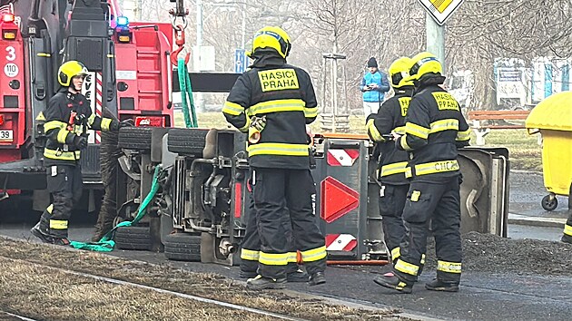 V Praze v ulici Bělohradská se převrátil vůz, který zametá chodníky. (24. února 2025)