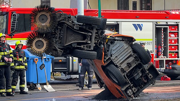 V Bělohorské ulici se převrátil na bok zametací stroj