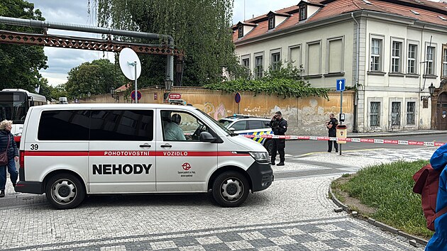 Speciální zásahové vozidlo pražského dopravního podniku zasahuje u úniku plynu v ulici Ke Karlovu v Praze. (19. května 2025)