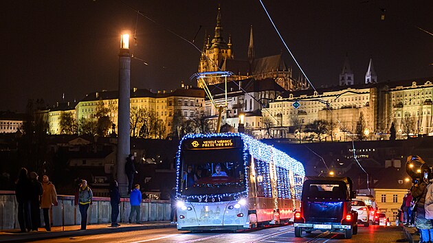 Vánočně vyzdobené tramvaje poprvé vyjely v sobotu odpoledne v průvodu, který vedl od Muzea MHD ve Střešovicích přes Hradčanskou, Letnou a Nábřeží Kapitána Jaroše k Právnické fakultě.
