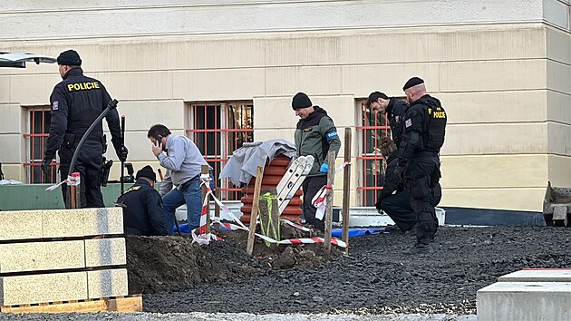 Vyšetřovatelé začali vykopávat kosterní ostatky, které nalezl bagrista na pražském Nedvědově náměstí. (18. prosince 2024)