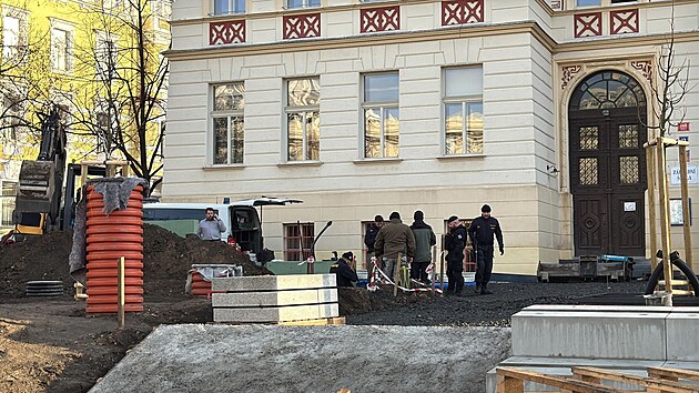 Vyšetřovatelé začali vykopávat kosterní ostatky, které nalezl bagrista na pražském Nedvědově náměstí. (18. prosince 2024)