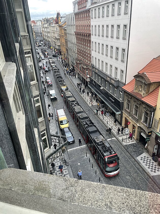 V centru Prahy nejde elektřina, tramvaje se poblíž Václavského náměstí štosují. (10. října 2025)