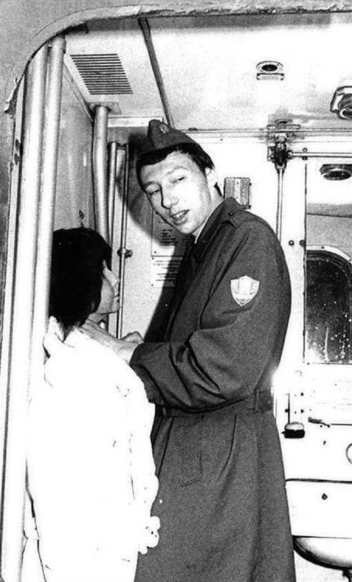 Hojer při rekonstrukci ve vlaku sestaveném na smíchovském nádraží předvádí vraždu Ivony S. Rekonstrukce si užíval, jak je vidět i na této fotografii.