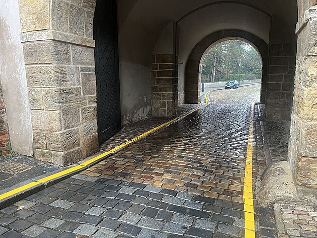 Žluté čáry značící zákaz zastavení a stání hyzdí historickou Táborskou bránu na Vyšehradě. (29. srpna 2025)