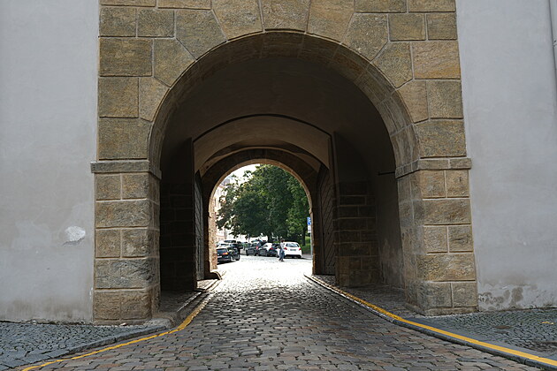 Žluté vodorovné značení protínající Táborskou bránu na pražském Vyšehradě. (8. září 2025)
