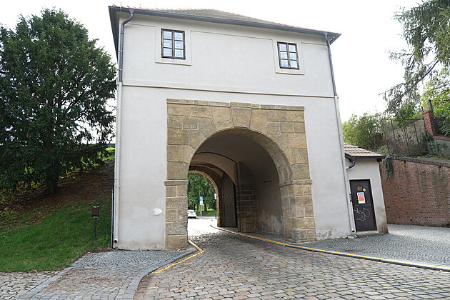Žluté vodorovné značení protínající Táborskou bránu na pražském Vyšehradě. (8. září 2025)