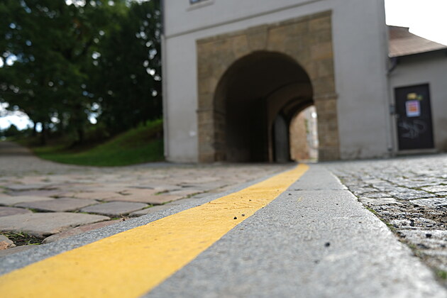 Žluté vodorovné značení protínající Táborskou bránu na pražském Vyšehradě. (8. září 2025)