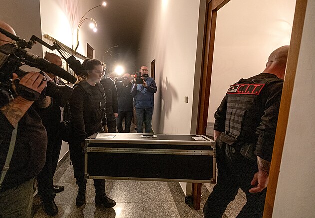 Pracovníci bezpečnostní agentury přivážejí do Betlémské kaple v Praze v bedně údajný Žižkův meč, který je ve dnech 11.-14. října 2024 součástí akcí k 600. výročí vojevůdcovy smrti. (10. října 2024)