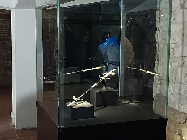 Vitrína v pražské Betlémské kapli, kde bude ve dnech 11.-14. října v rámci výročí připomínky 600 let úmrtí Jana Žižky vystaven jeho údajný meč (10. října 2024)