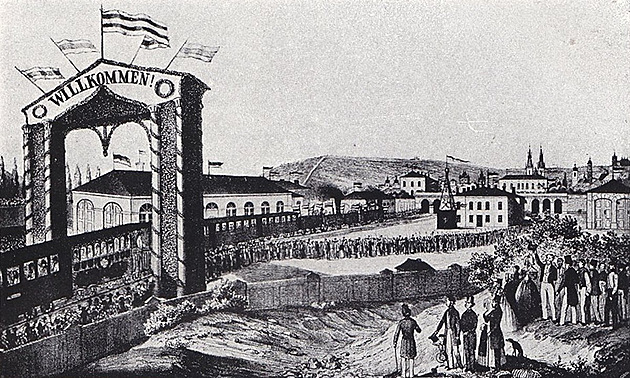 Slavnostní příjezd parního vlaku do Prahy v roce 1845