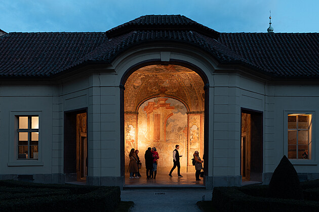 Slavnostně nasvícené sochy ve Vrtbovské zahradě. (9. dubna 2025)
