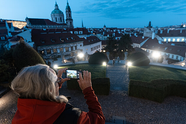 Slavnostně nasvícené sochy ve Vrtbovské zahradě. (9. dubna 2025)