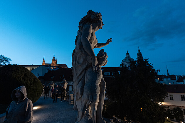 Slavnostně nasvícené sochy ve Vrtbovské zahradě. (9. dubna 2025)